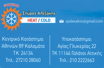 customer tabsΕπικοινωνίαΨυκτικές Εγκαταστάσεις - Είδη και ΥλικάΨυκτικοίΜελέτη,Τοποθέτηση, Επισκευή, Συντήρηση ΚλιματιστικώνΨυκτικά ΜηχανήματαΔόμηση - ΚατοικίαΛοιπάΑθηνών 89, ΚαλαμάταΑγίας Γλυκερίας 22Α, ΓαλάτσιΚΑΛΑΜΑΤΑ ΜΕΣΣΗΝΙΑΣΜΕΣΣΗΝΙΑΠΕΛΟΠΟΝΝΗΣΟΣ 2721028060 6973008863spalexakis@gmail.com Το προτείνω (έχει προταθεί 1 φορές) ΦωτογραφίεςFacebook LikeShare on FacebookTweet Widget